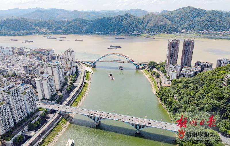 8月29日,桂江宛如一條碧綠絲帶穿城而過,江面貨船往來盡顯水運活力,遠處青山含翠,藍天白云映襯,一幅山水與城市交融的美麗畫卷緩緩鋪展,展現梧州獨特的城市風貌與蓬勃生機(無人機照片)。 梧州日報記者 李燦明 攝