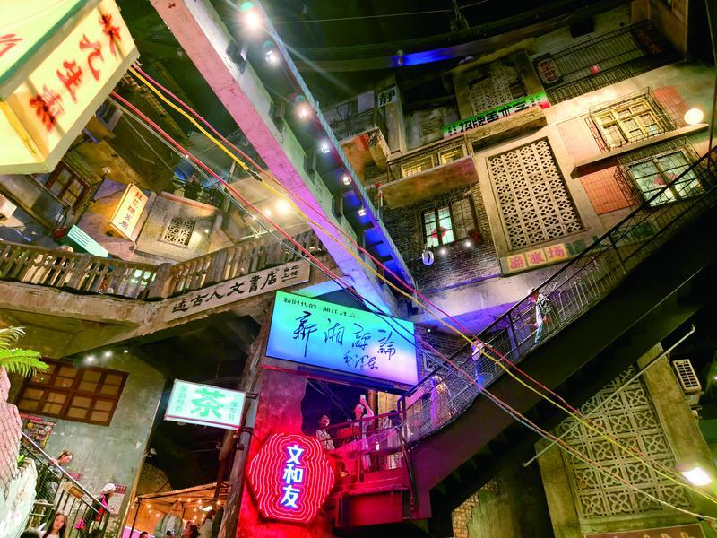 文和友的內(nèi)部,由老店舊街圍成一個天井,中間的互通橋梁,是鐵制的各種樓梯,橫的、豎的、彎的、直的,油著黑漆,锃光瓦亮。我們探頭出去,看到鄰層的某處有感興趣的店,或者是網(wǎng)上攻略推薦的某個打卡點,便可以借助黑色的金屬鏈接,“蹬蹬蹬”地跑過鐵做的過道,仿佛從一處光陰跑進另一處光陰。腳的觸感,就像在梧州走過浮橋。我們在這里偶遇了老式照相館,邂逅了國營門市部,還與戴著紅袖標的保潔阿姨打上了招呼。
