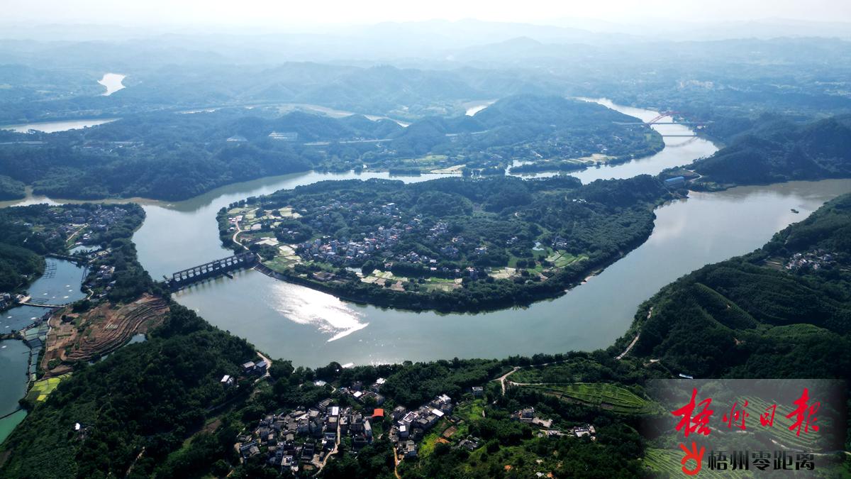近日,航拍視角下的藤縣金雞鎮新民村洲地半島。蜿蜒的北流河環抱洲地半島,島上村落與農田錯落有致,勾勒出一幅和美的山水畫卷。