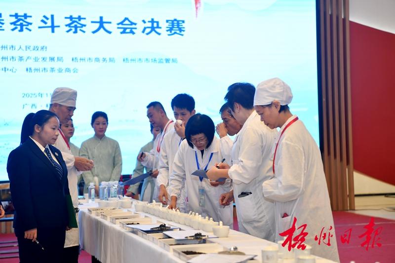 評審現場,評委們或凝神細嗅,或啜茶沉吟,交流品茶味道后在評分表上謹慎落筆,部分優秀茶樣憑借出色表現斬獲高分。“今年斗茶大會的茶樣數量足、質量高,充分展現了茶企、茶人參與的熱情。”決賽專家評委、河南省茶葉商會副秘書長李亞磊表示,梧州舉辦斗茶大會,既提升了茶企茶人生產技術與群眾品鑒水平,更促進行業良性發展,讓六堡茶品牌影響力持續擴大。